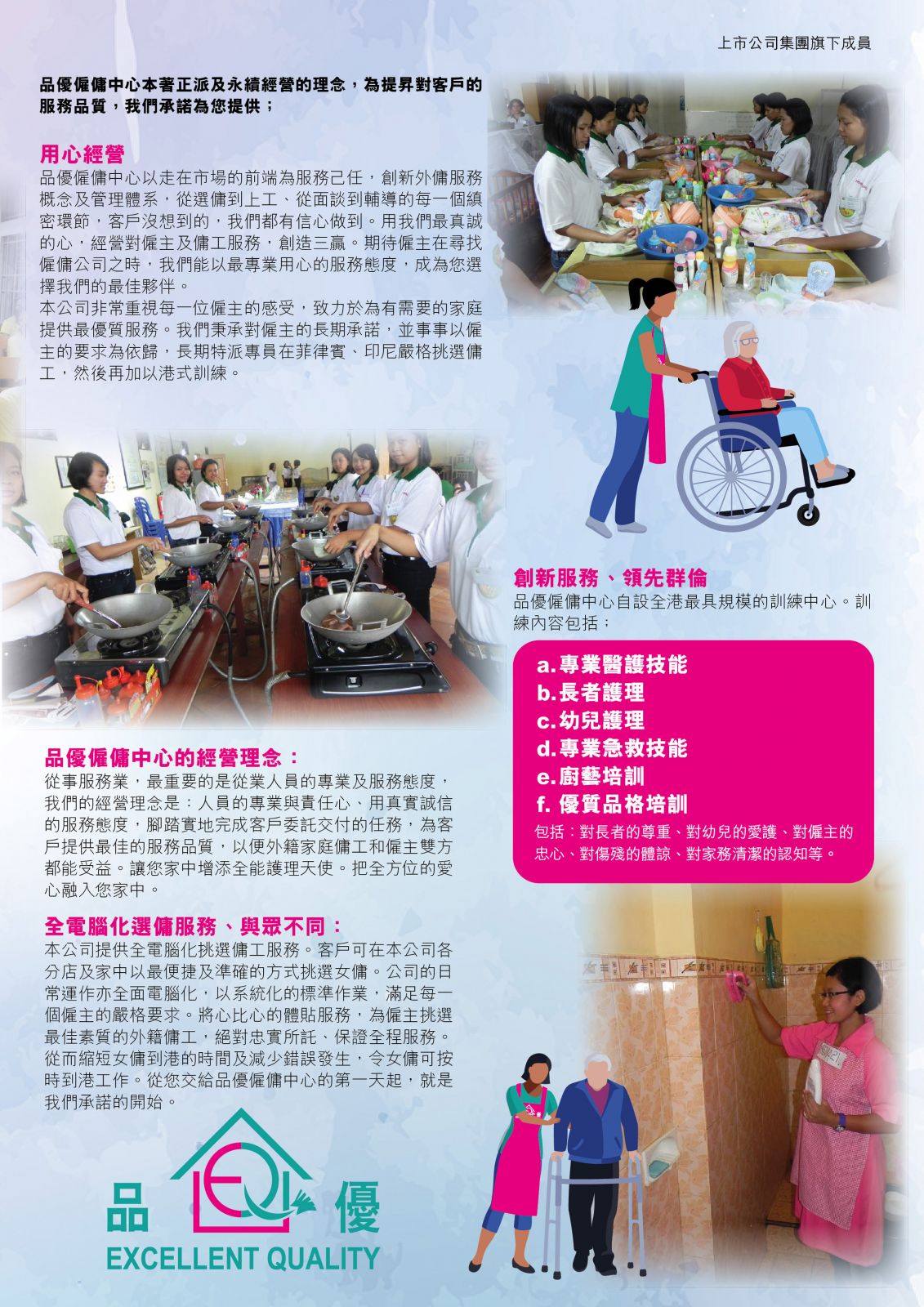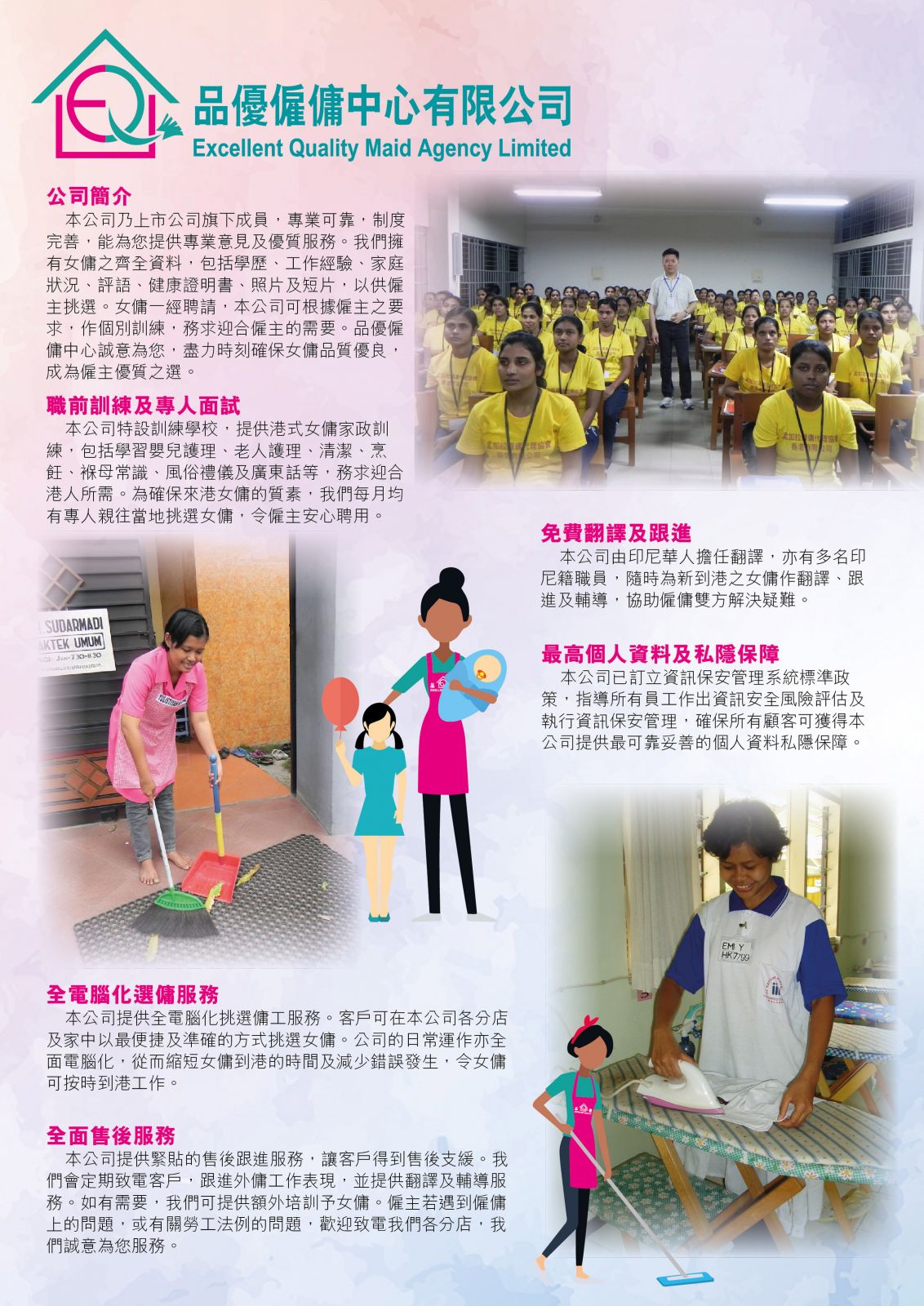 | 本公司已訂立資訊保安管理系統標準政策,指導所有員工作出資訊安全風險評估及執行資訊保安管理,確保所有顧客可獲得本公司提供最可靠妥善的個人資料私隱保障。 | 本公司提供全電腦化挑選傭工服務。客戶可在本公司各分店及家中以最便捷及準確的方式挑選女傭。公司的日常運作亦全面電腦化,從而縮短女傭到港的時間及減少錯誤發生,令女傭可按時到港工作。 | 本公司提供緊貼的售後跟進服務,讓客戶得到售後支緩。我們會定期致電客戶,跟進外傭工作表現,並提供翻譯及輔導服務。如有需要,我們可提供額外培訓予女傭。僱主若遇到僱傭上的問題,或有關勞工法例的問題,歡迎致電我們各分店,我們誠意為您服務。 |